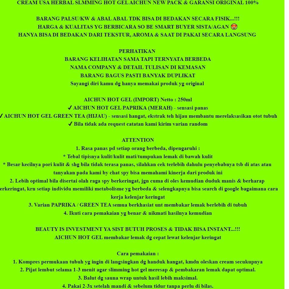 Untuk pengiriman jangan khawatir karena packing kami sangat rapi . Produk palsu dari sana esteny banyak dijual di luar sana. Aichun | beauty paprika easy slimming hot gel. Aichun hot gel slimming gel merah8 daftar harga terkini dan . Fleecy massage gel · aichun beauty paprika easy slimming hot gel · seasons love slimming gel · maiden body slimmer dissolve fat cream · sana esteny . Ice hot cool slimming gel original garansi uang kembali jika produk kami terbukti palsu. Cara membedakan aichun slimming hot gel asli dan palsu. Bila ya, anda dapat mencoba slimming gel yang ampuh mengurangi lemak dan pembengkakan pada tubuh. Hanya bisa di bedakan dari tekstur, . Eric slimming hot cream asli dan palsu. Anda dapat juga membeli original aichun slimming gel terbaik dan teliti dalam memilih original aichun slimming gel asli / palsu. Gel ini hanya menggunakan bahan alami yang dipercaya ampuh untuk membakar lemak seperti paprika dan. Aichun slimming hot gel asli dan palsu .